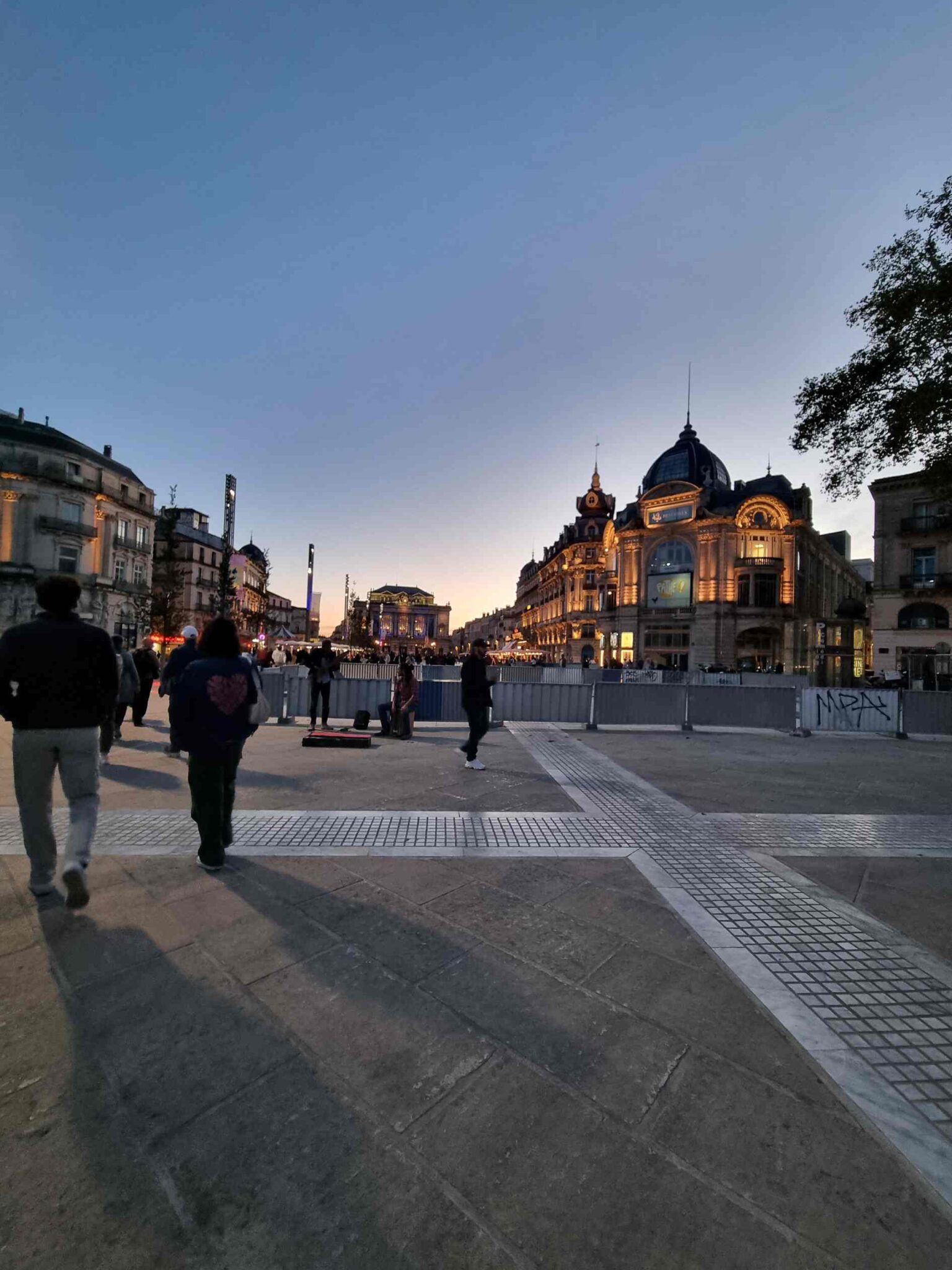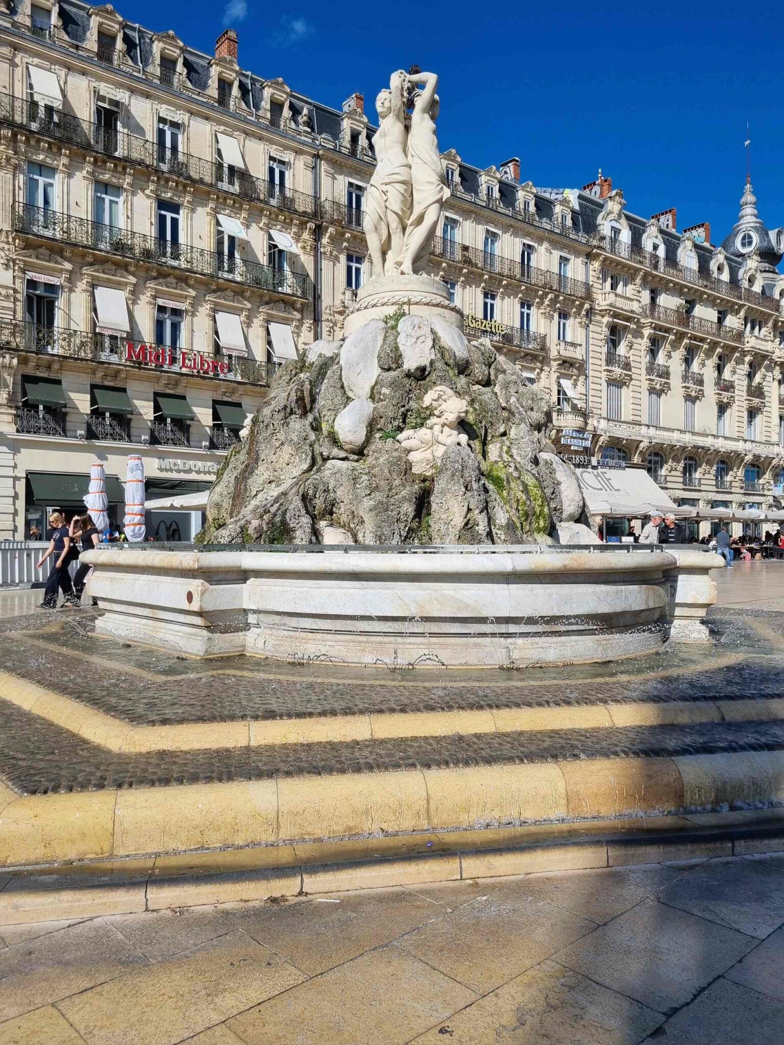 Många små fontäner som ser ut som de flamingon som bor i etangen utanför staden (jazzmusik i bakgrunden):