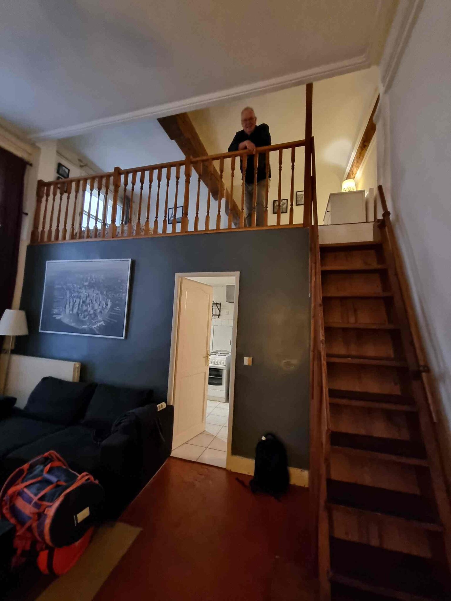 Lägenheten är jättefin med vardagsrum, kök, badrum och ett sovloft en brant trappa upp. Huset är från 1600-talet och ligger mitt i den gamla stadskärnan.