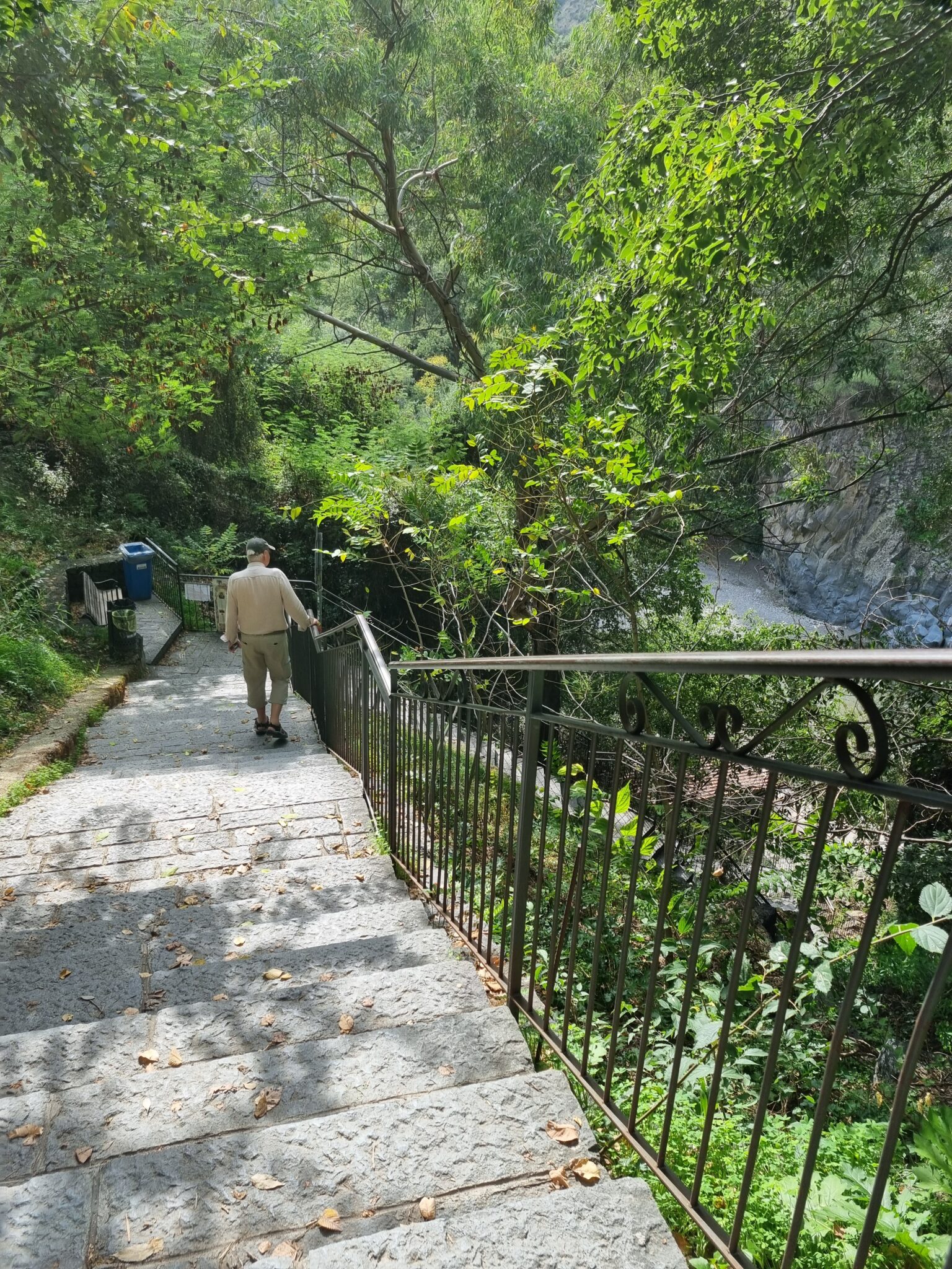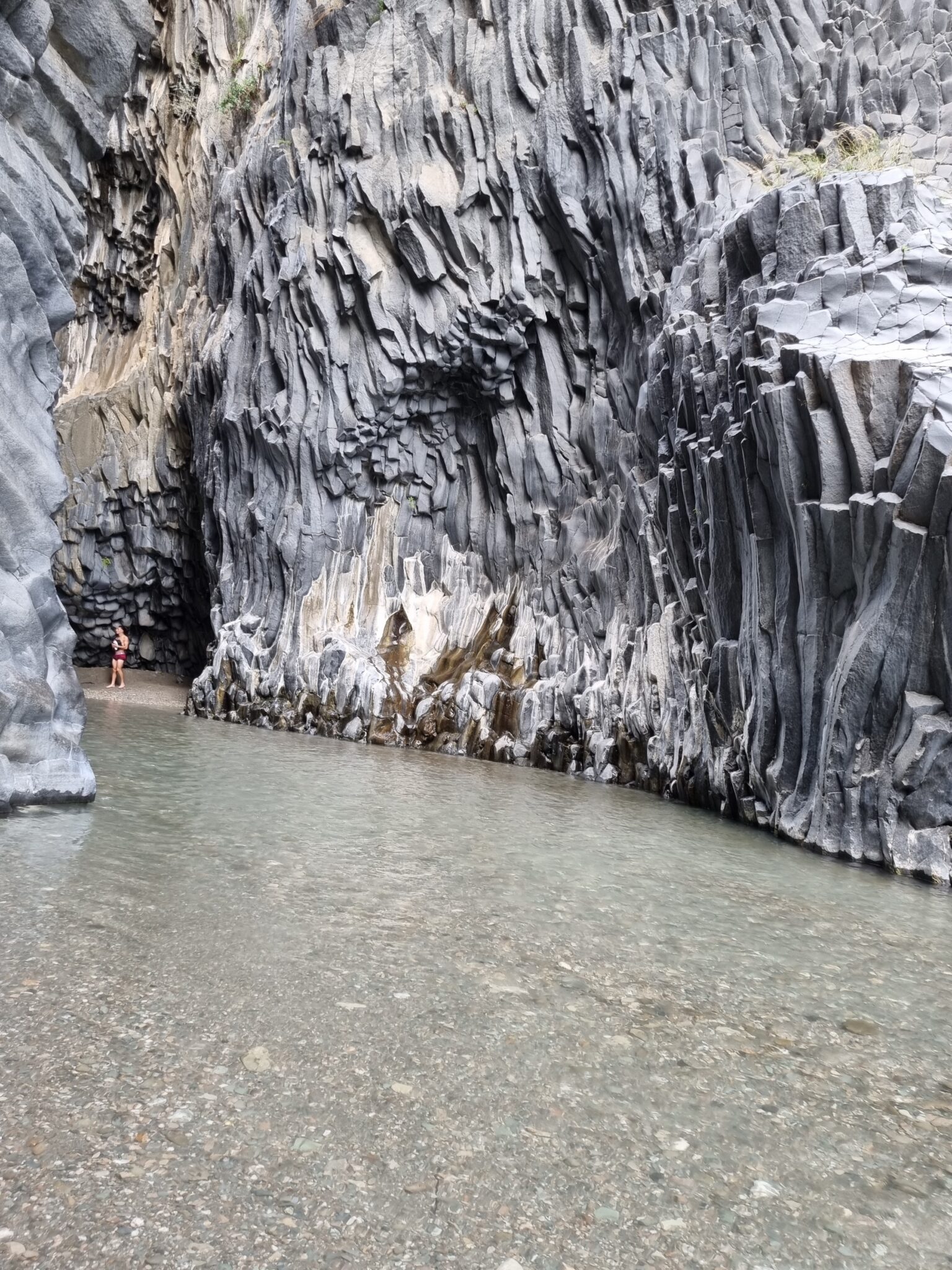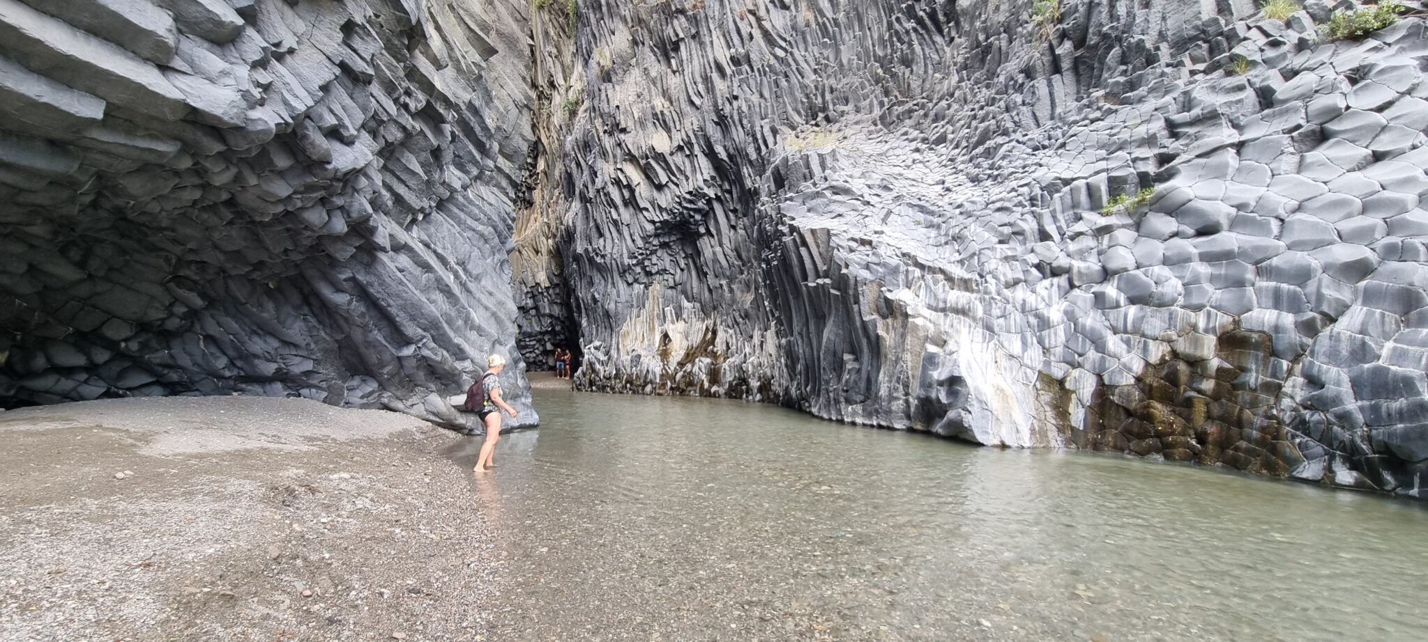 Floden Alcantara på östra Sicilien har genom årtusenden grävt sig ner i de vulkaniska bergarterna och bildat en kanjon. Vi åkte dit och gick trapporna ner till det som är kvar av floden.